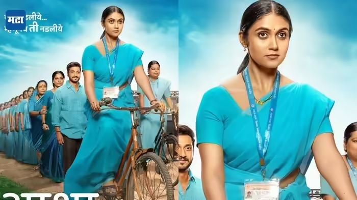 Directed by Deepak Patil, the poster features Rinku dressed in a simple blue saree, wearing a mangalsutra and an Asha Sevika identity card—symbolizing her character’s grounded, everyday courage. Another striking image shows her confidently riding a bicycle, capturing the determination at the heart of the film’s story.The cast includes notable names such as Disha Dande (famous for Disha Dande), Saikit Kamat from the serial Savlyachi Shadow, and veteran actress Usha Naik. Other supporting actors include Shubhangi Bhujbal, Suhas Shirsat, Dilip Ghare, Harsha Gupte, Rupesh Khare, Rajan Pawar, and Bhumika Desle. The film’s tagline, “Bai Adalye Ti Nadalye!” (“The woman who’s stuck, that’s why she’s stuck!”), hints at a powerful narrative around struggle and resilience.